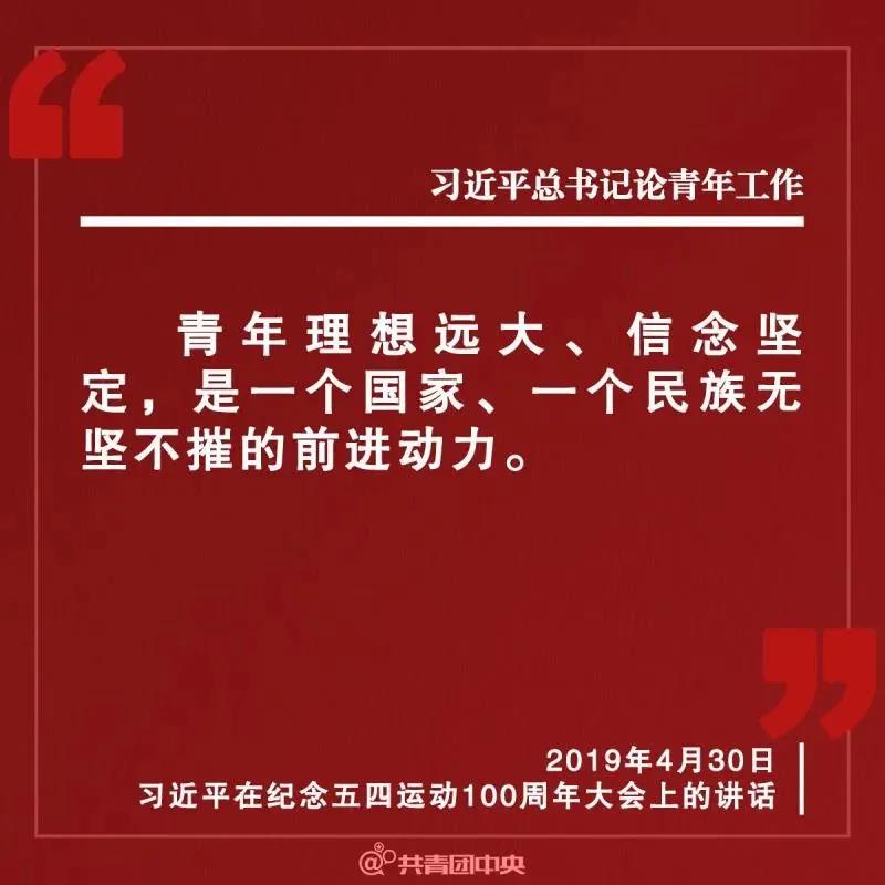 “在革命、建设、改革各个历史时期,中国共产党始终高度重视青年、关怀青年、信任青年,对青年一代寄予殷切期望。中国共产党从来都把青年看作是祖国的未来、民族的希望,从来都把青年作为党和人民事业发展的生力军,从来都支持青年在人民的伟大奋斗中实现自己的人生理想。”2013年5月4日,习近平总书记在同各界优秀青年代表座谈时指出。