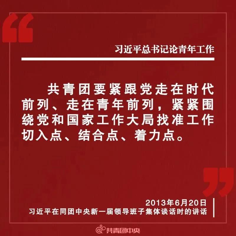 2013年6月20日,习近平总书记在同团中央新一届领导班子成员集体谈话时强调:“共青团要紧跟党走在时代前列、走在青年前列,紧紧围绕党和国家工作大局找准工作切入点、结合点、着力点,充分发挥广大青年生力军作用,团结带领广大青年在实现中华民族伟大复兴的征途中续写新的光荣。”