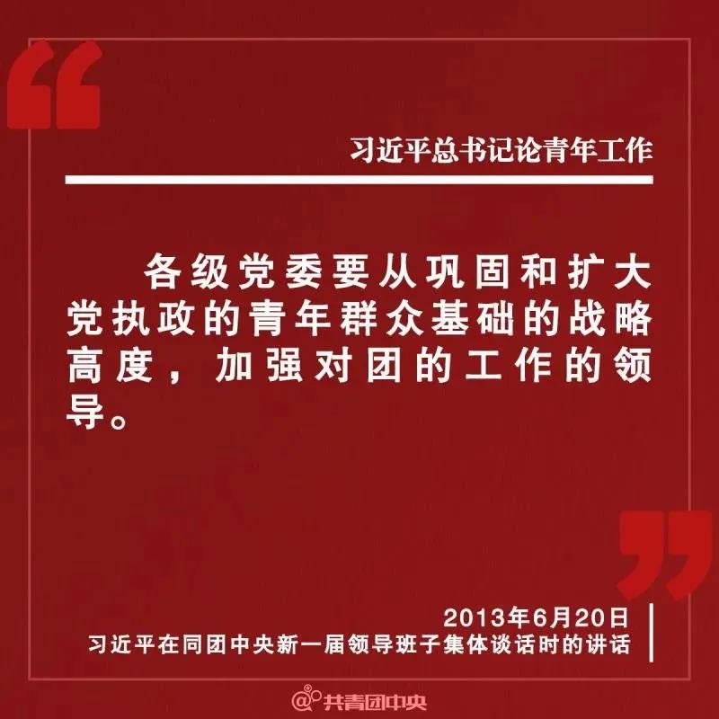 2013年6月20日,习近平总书记在同团中央新一届领导班子成员集体谈话时指出:“各级党委要从巩固和扩大党执政的青年群众基础的战略高度,加强对团的工作的领导,为团组织提供良好工作环境和条件。各级党委要热情关心、严格要求团干部,帮助他们树立正确的世界观、权力观、事业观,做他们建功成才路途上的良师益友。”