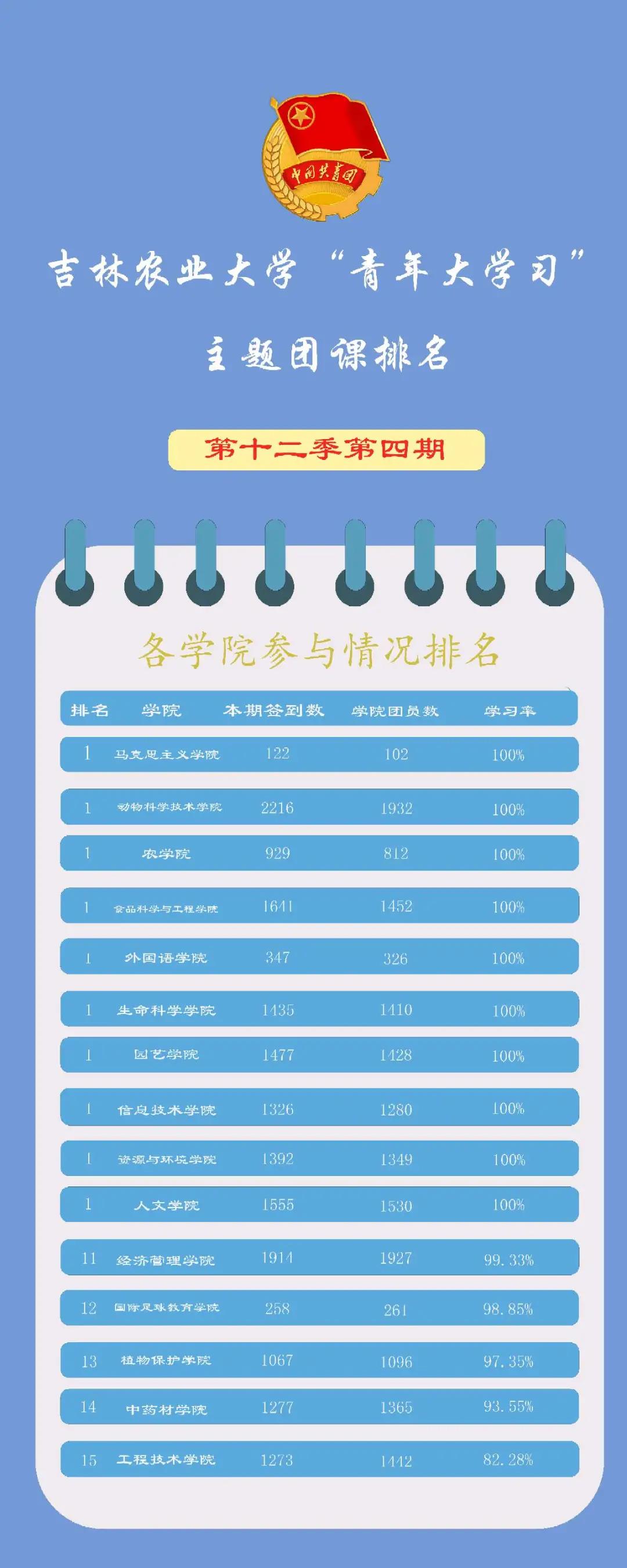 上一期“青年大学习”网上团课中,按照参与率排名,马克思主义学院、动物科学技术学院、农学院、食品科学与工程学院、外国语学院、生命科学学院、园艺学院、信息技术学院、资源与环境学院、人文学院获得并列第一名。