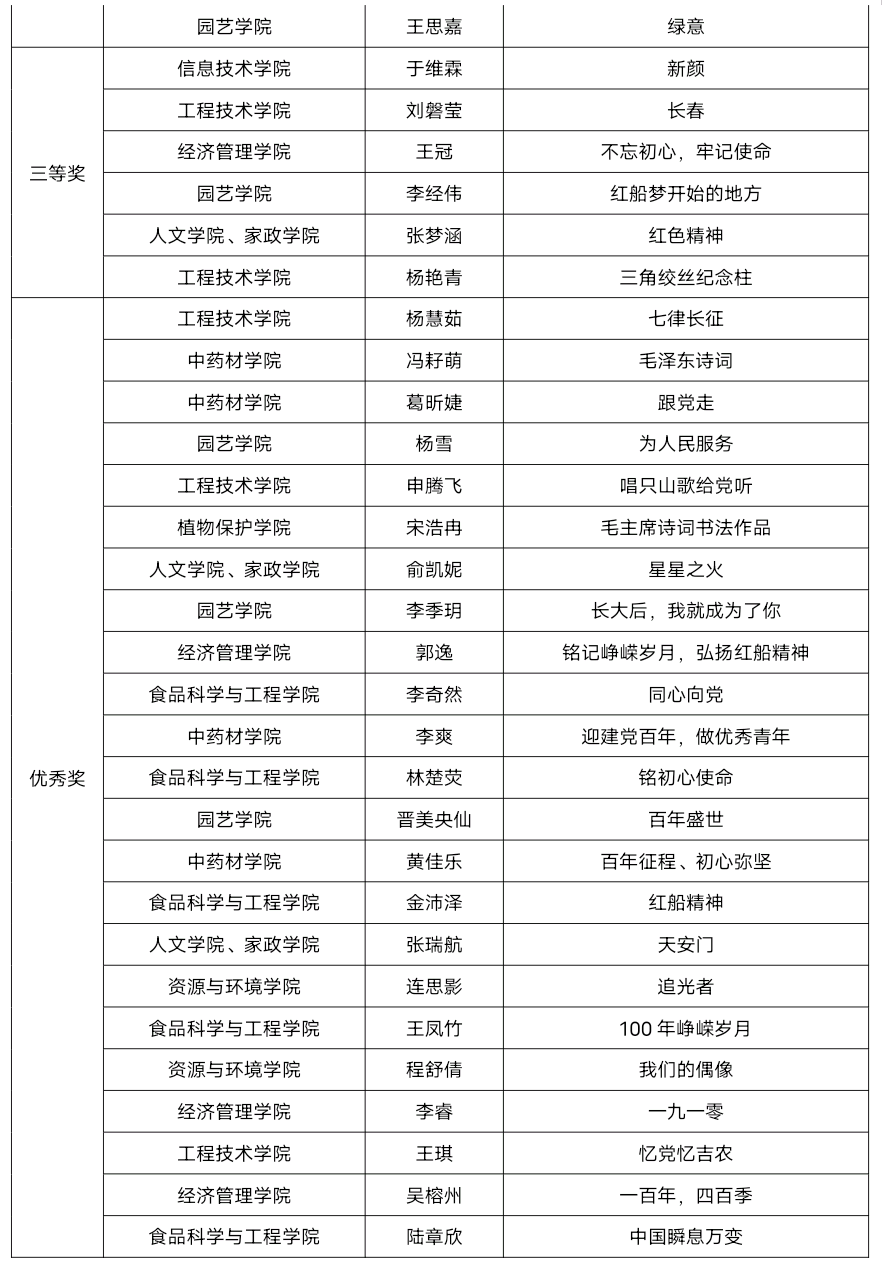 为庆祝中国共产党成立100周年,传承红色基因,弘扬中华民族优秀传统文化,营造健康向上的校园文化氛围,我校于6月份开展了“学党史、强信念、跟党走”主题教育系列活动—庆祝中国共产党成立100周年艺术作品联展活动。经过层层筛选,在各学院上交的作品中评选出一等奖、二等奖、三等奖和优秀奖作品46件。现将评选结果公布如下: