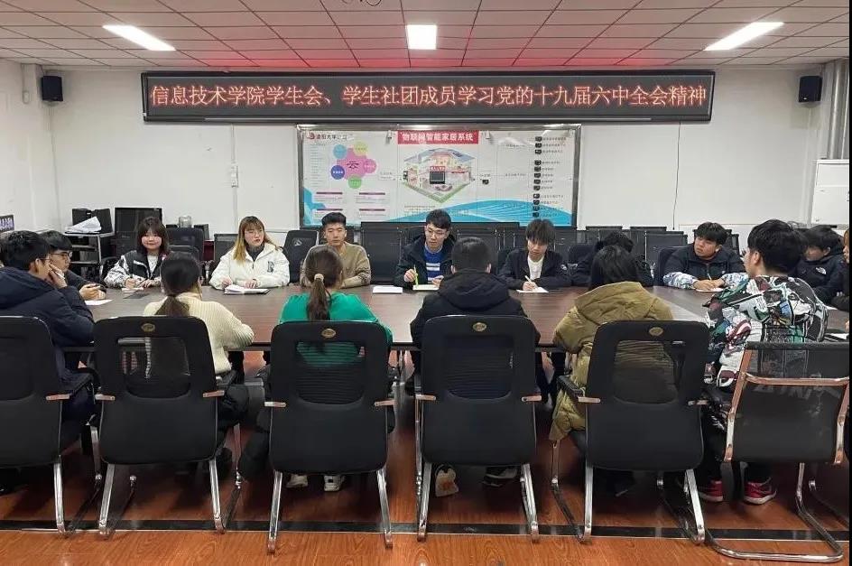 信息技术学院团委组织学生骨干、“青马”学员和团员青年,通过线上线下相结合和集中分散相结合的方式,观看了党的十九届六中全会新闻发布会,并开展了系列学习活动。通过学习,进一步提升学院青年学生的政治理论素养,增强“四个意识”、坚定“四个自信”、做到“两个维护”,大家自觉将会议精神学懂、弄通、做实,主动将理论学习成果践行于全心全意服务同学之中。