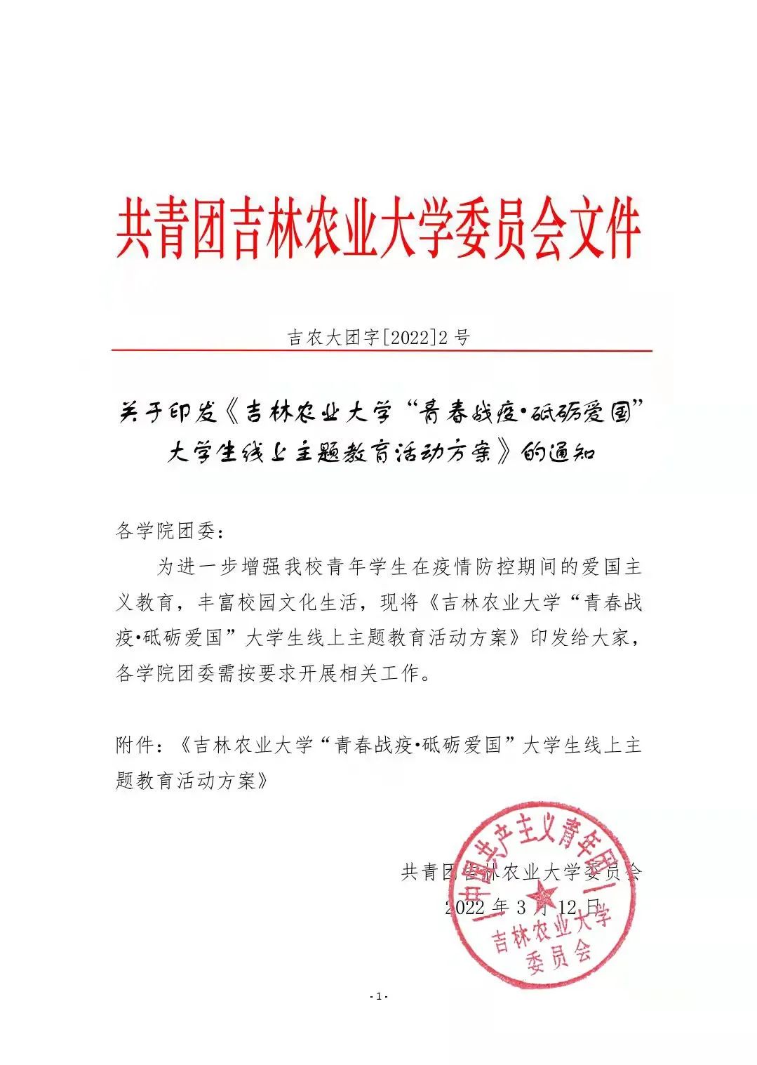 1.“凝心聚力·共抗疫情”主题艺术作品联展。为迎接和学习宣传党的第二十次全国代表大会,庆祝中国共青团成立100周年,进一步引导广大青年学生把抗击疫情作为推进学校思想政治教育的重要实践,丰富学生校园文化生活,开展艺术作品联展线上活动。比赛共分为绘画、书法、设计和短视频四个方面,具体内容详见附件1《关于举办2022年吉林农业大学“凝心聚力共抗疫情”艺术作品联展的通知》。