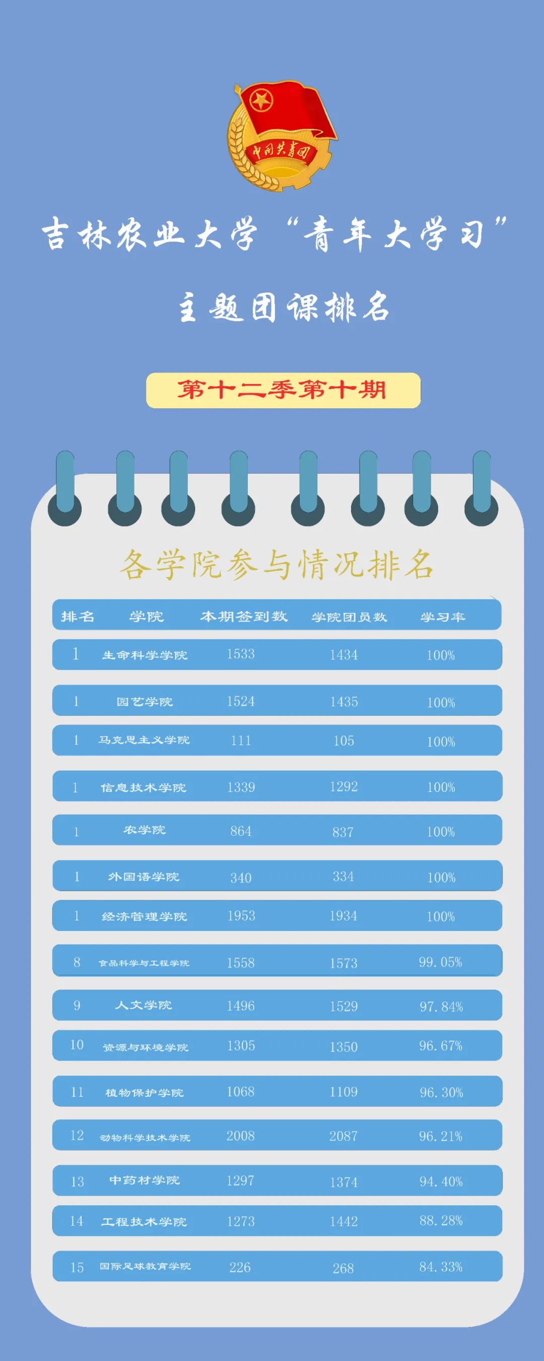 上一期“青年大学习”网上团课中,按照参与率排名(排名不分先后),生命科学学院、园艺学院、马克思主义学院、信息技术学院、农学院、外国语学院、经济管理学院、获得并列第一名。