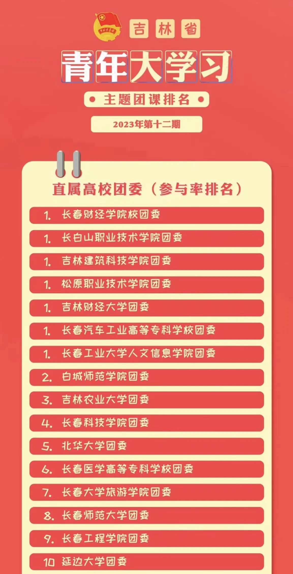 吉林省“青年大学习”网上主题团课2023年第12期直属高校前十名