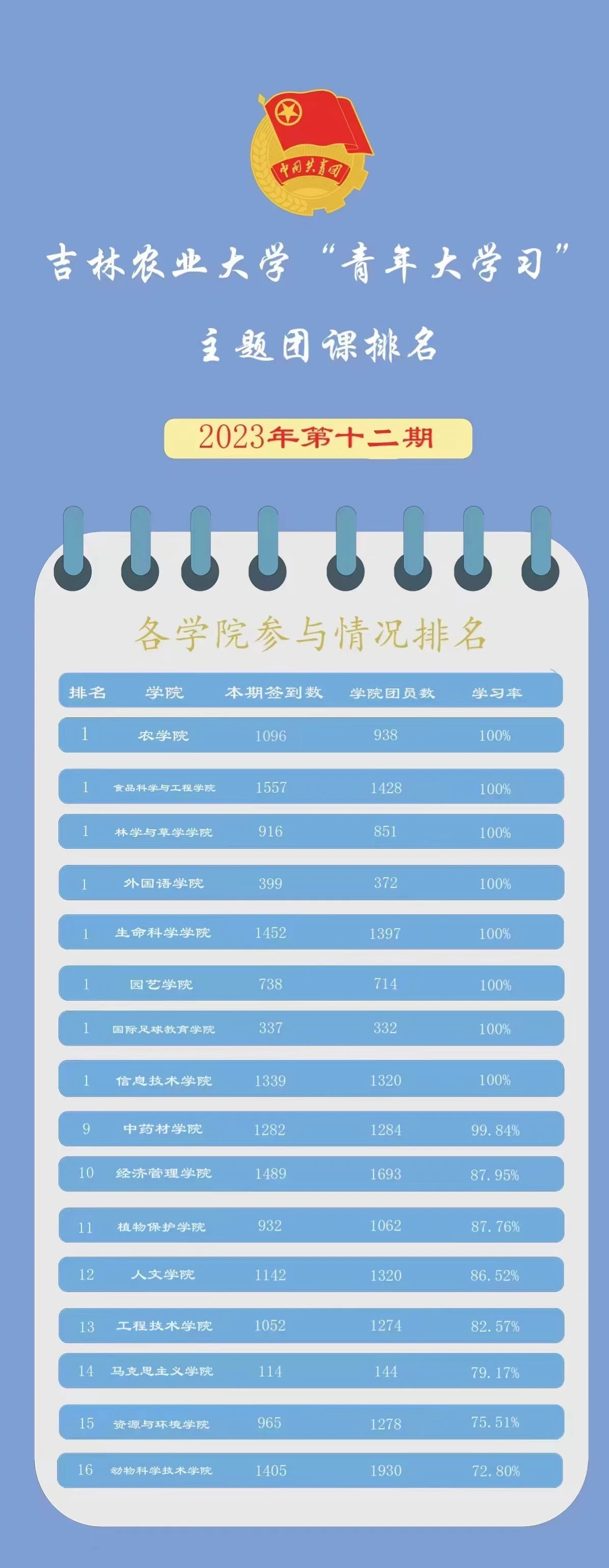 吉林农业大学“青年大学习”网上主题团课2023年第12期各学院参与情况排名