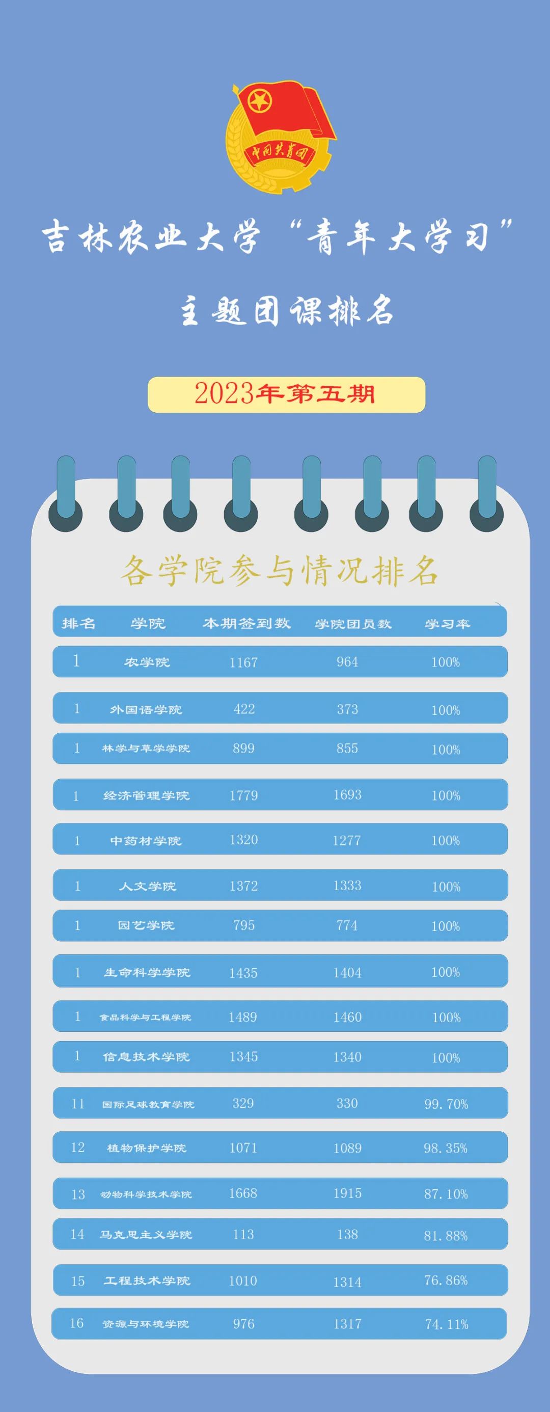 吉林农业大学“青年大学习”网上主题团课2023年第5期各学院参与情况排名