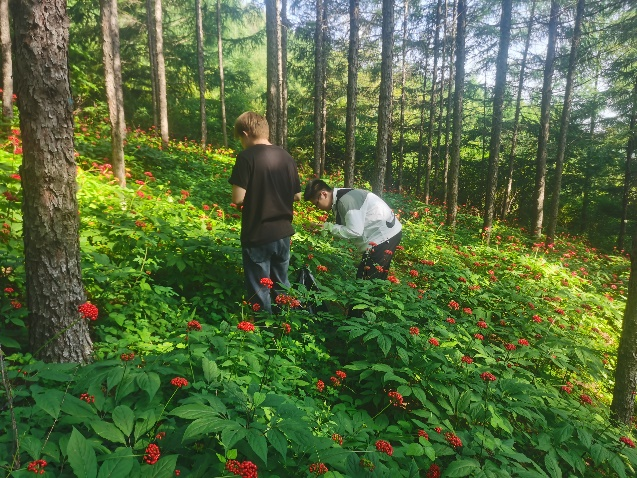 7月20日-7月22日雷秀娟老师带领两名研究生和七名本科生前往辽宁省丹东市宽甸满族自治县人参种植基地观察人参的茎叶性状、果实性状和种子性状,并且进行记录与采样。8月3日-8月8日雷秀娟老师又带领一名博士生、四名研究生和两名本科生前往吉林省延边朝鲜族自治州安图县、汪清县以及白山市抚松县的人参种植基地进行采样。采样主要采集特殊果色,茎较为粗壮,颜色统一,叶较大,形状特别,叶片数不为5片的人参果实。人参每年茎、叶、果实等都会出现不同性状,随着人参一年一年的生长,进行不同果色人参之间受粉,每年都会发现人参新的果色。为使参农更好的种植人参,得到更好的经济效益,中药材学院每年都会带领同学进行采样调查再进行后续研究。
