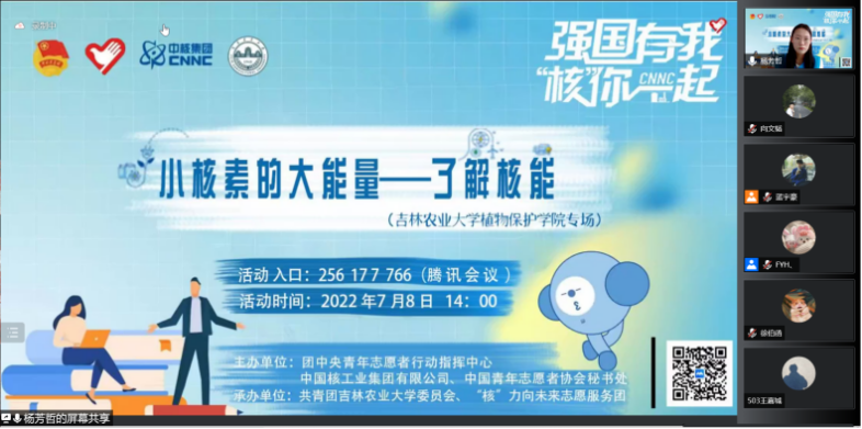 2022年7月8日起吉林农业大学“核”力向未来志愿服务团通过腾讯会议平台,面向吉林农业大学15个学院共计开展主题宣讲12场。