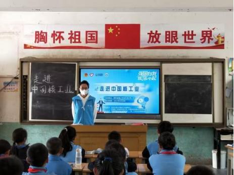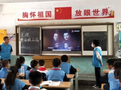 团队成员周俊彤以“两弹元勋”邓稼先先生的故事为切入点,向六年级学生介绍了核工业基础—核反应,着重强调了新中国核工业从无到有,由弱到强的背后,离不开的是一代代胸怀祖国、服务人民、具有爱国精神的核工业人。引导学生体会我们如今的幸福生活来之不易,作为祖国未来的建设者和接班人,要从小立志、立大志,向功勋人物学习。