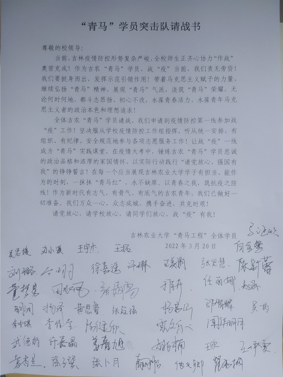 2022年初,新型冠状病毒感染的肺炎疫情再次出现在我国部分省市地区,吉林省因出现感染病例,城市里已经打响了疫情防控阻击战。学校为了落实省委省政府疫情防控安排部署,校园内也采取了科学防疫措施。疫情就是命令,防控就是责任。学校“青马工程”学员闻令而动,迅速集结,自发组成了“青马”学员突击队,并纷纷向学校递交请战书,誓想要在这场战“疫”中弘扬“青马”精神,贡献青春力量!