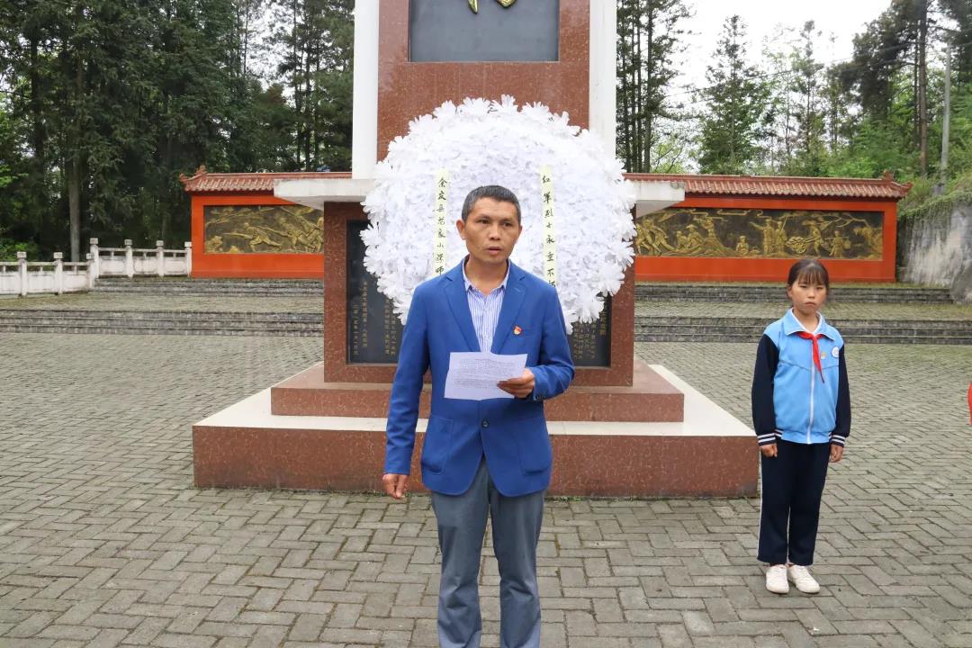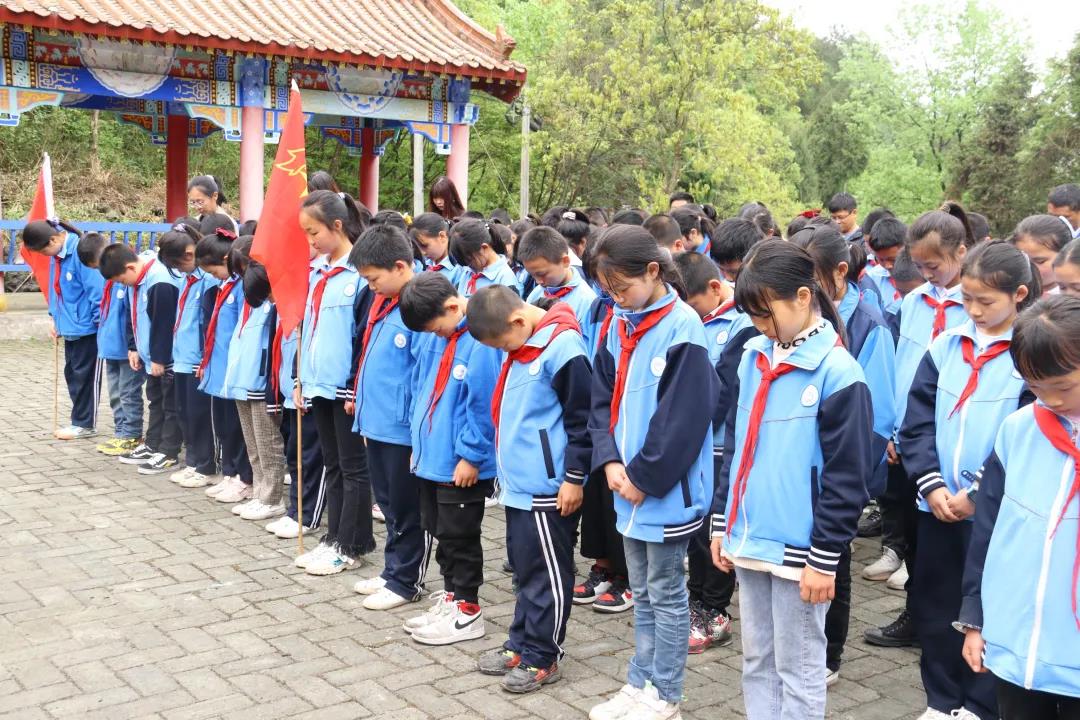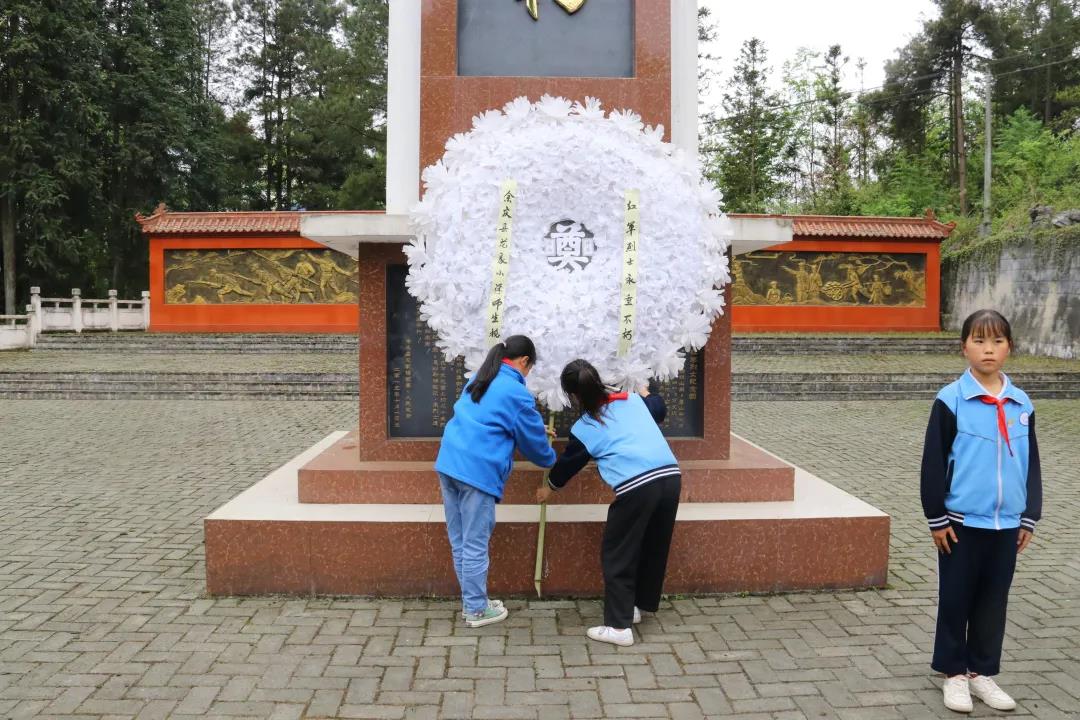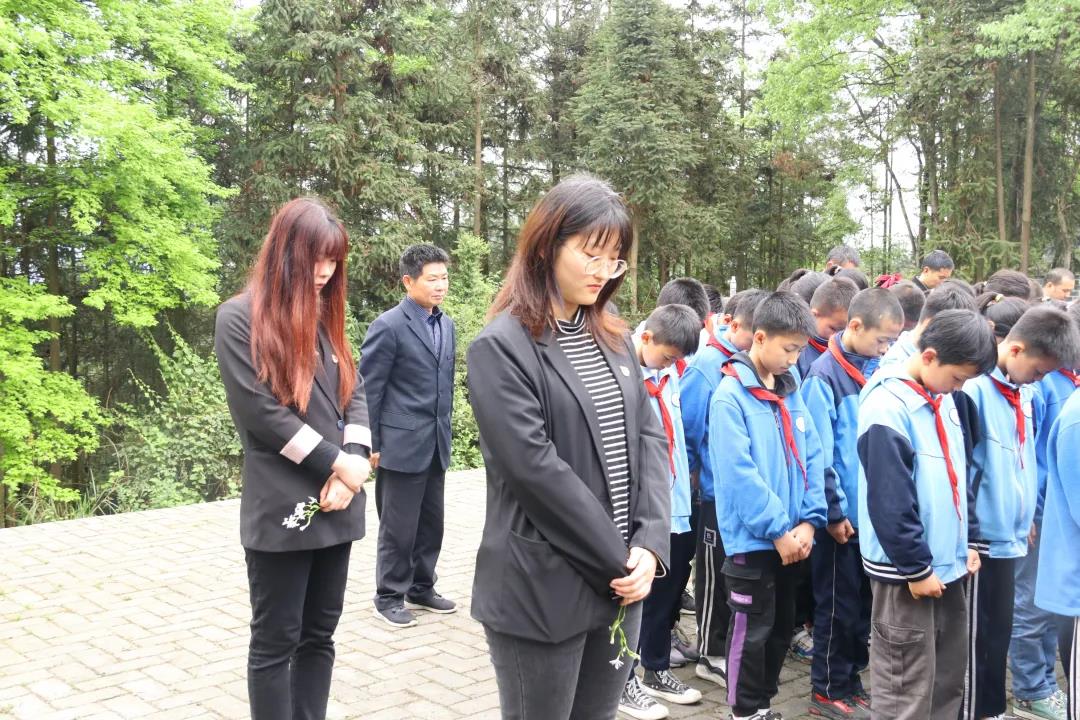 下午2点始,学校全体五年级学生、学校部分教师、研究生支教团全体成员重走红军路,徒步前往距离学校五公里远的余庆县龙家镇万丈坑红军坟开展清明节主题教育活动。3点,师生们来到了庄严肃穆的烈士墓前,举行了简短而又隆重的扫墓仪式,学生代表向红军烈士敬献花圈后,所有师生向红军烈士献上小白花,全体默哀三分钟。