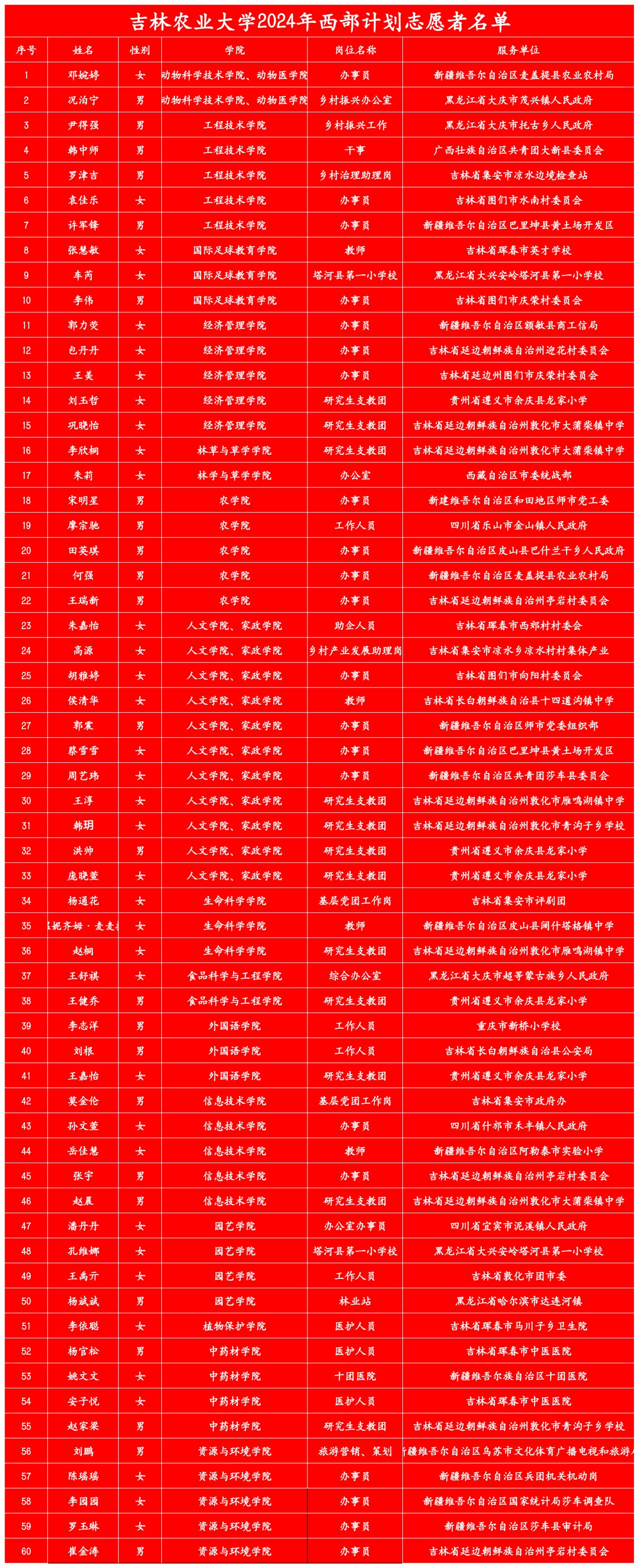 多年来,我校党委始终高度重视西部计划志愿者的招募培养和派遣工作,严格标准,认真部署。2024年大学生志愿服务西部计划我校青年学生积极报名,经过资格审核、心理测试、面试等环节层层筛选,最终共60名志愿者到岗服务,其中新疆维吾尔自治区12人、新疆生产建设兵团4人、西藏自治区1人、广西省1人、重庆市1人、四川省3人、吉林省27人、黑龙江省6人、贵州省5人。