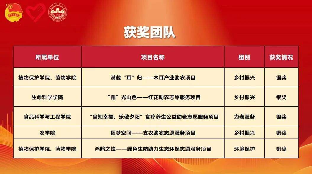 本次大赛聚焦科技创新、乡村振兴、绿色发展、社会服务等青年志愿服务工作重点领域,牵动全国14000余个志愿服务项目参与。经过激烈角逐,我校荣获国奖5项。其中,植物保护学院、菌物学院《满载“耳”归——木耳产业助农项目》,生命科学学院《“槲”光山色——红花助农志愿服务项目》,食品科学与工程学院《“食知幸福、乐敬夕阳”食疗养生公益助老志愿服务项目》荣获银奖;农学院《稻梦空间——支农助农志愿服务项目》,植物保护学院、菌物学院《鸿鹄之蜂——绿色生防助力生态环保志愿服务项目》荣获铜奖。