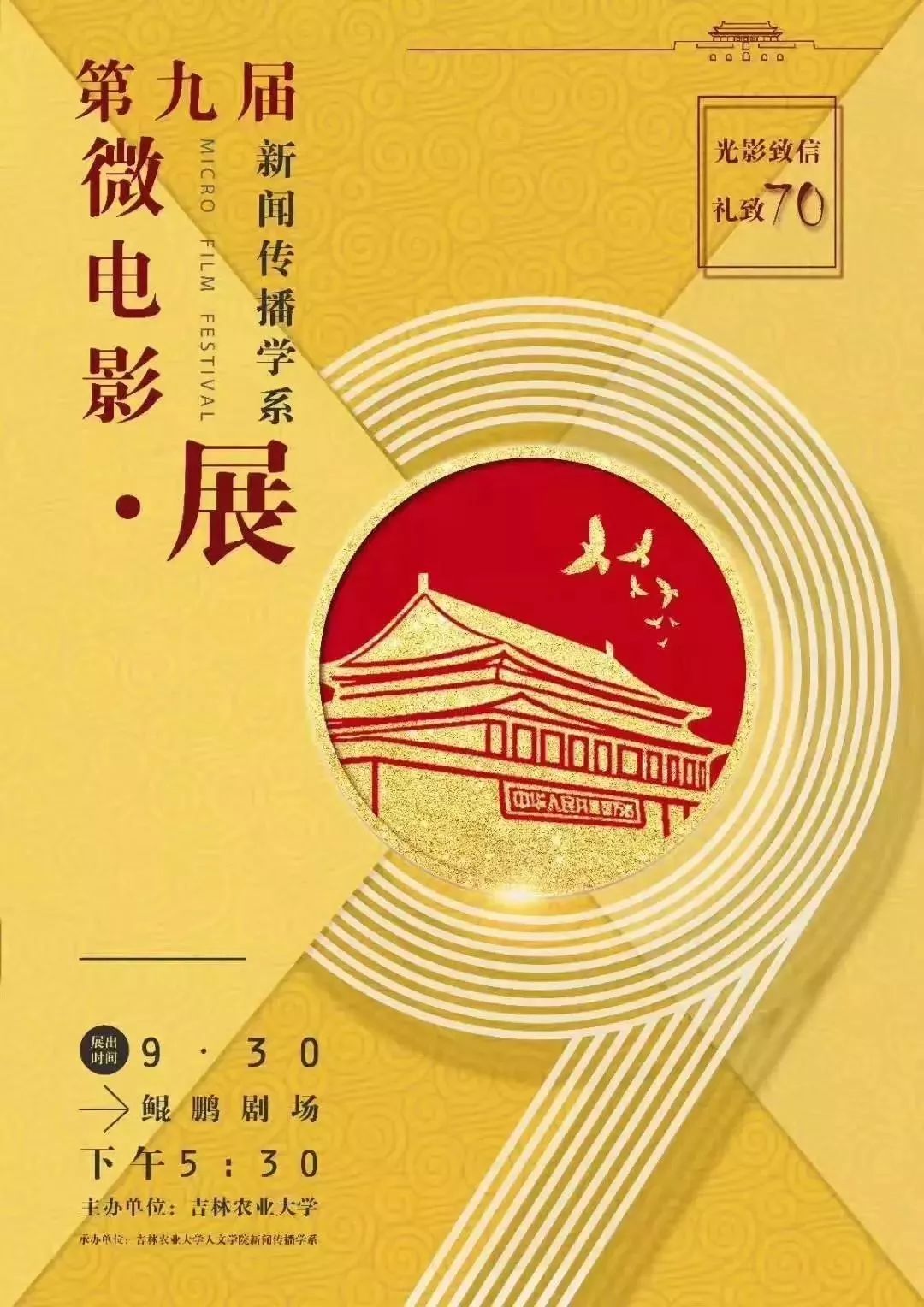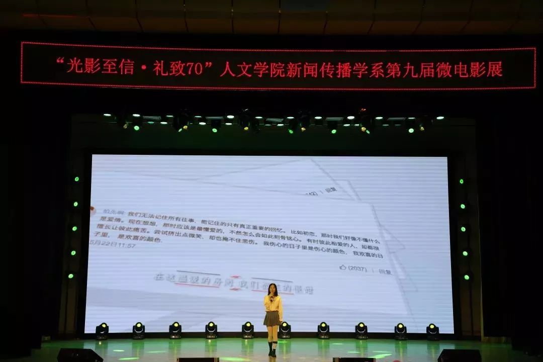 为庆祝祖国70周年华诞,向伟大祖国感恩献礼。人文学院于9月30日在鲲鹏学生文化活动中心举办了以“光影至信,礼致70”为主题的第九届微电影展。