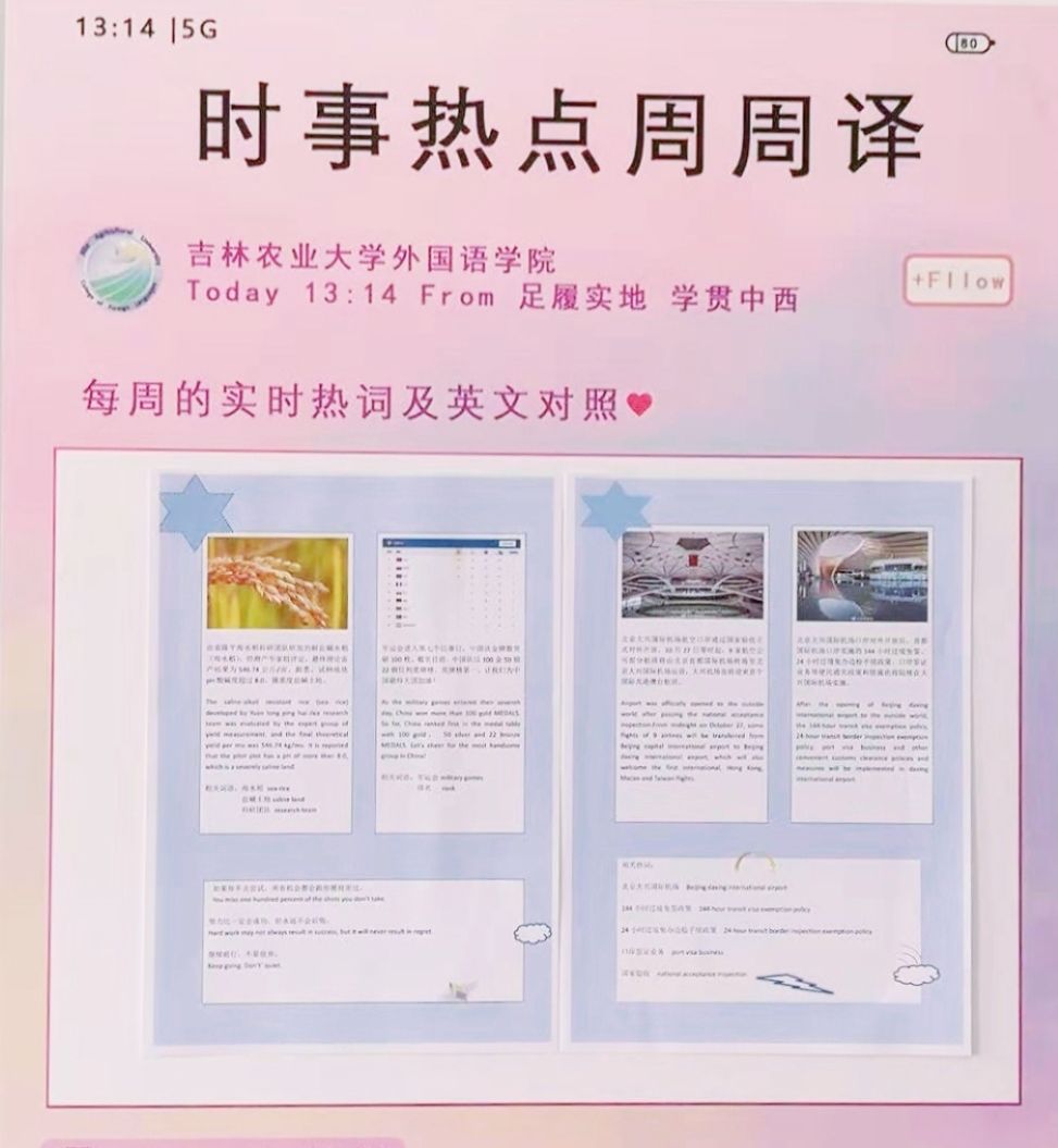 “时事热点周周译”活动是外国语学院为深入贯彻习近平新时代中国特色社会主义思想和党的十九大精神而推出的专题学习活动。该活动以国内外时事热点为主要议题,线上线下同步进行,将每周发生的时事热词以中英文对照的方式张贴,供同学学习。