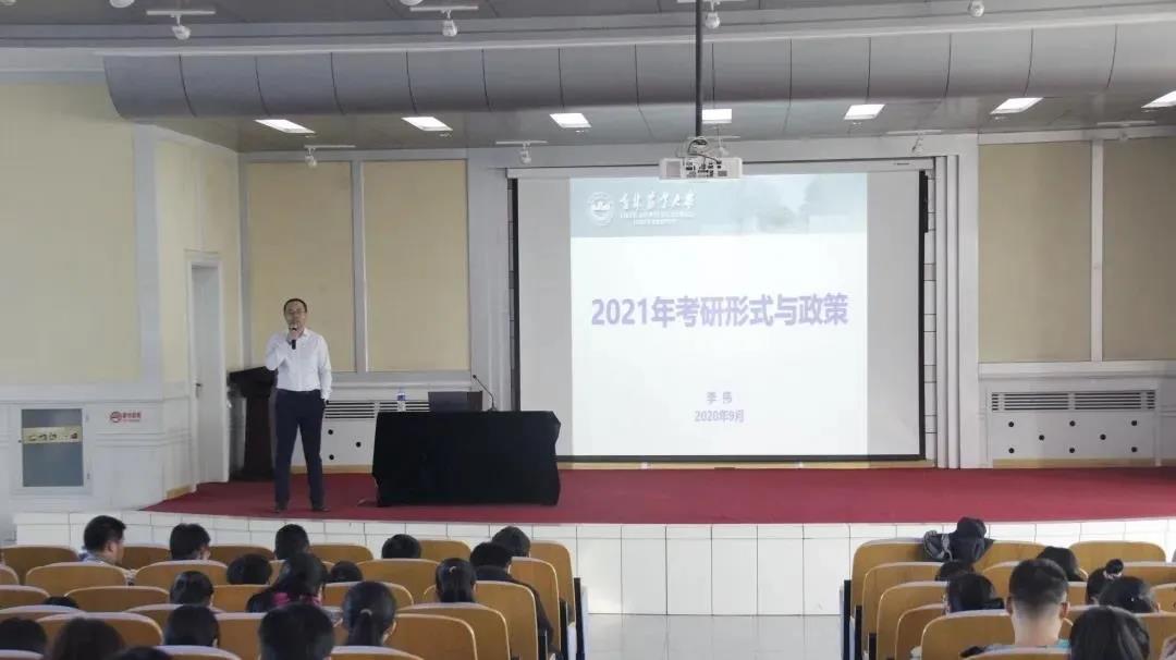 学院副院长李伟结合往届优秀考研毕业生的实例从为什么要考研、如何成功“上岸”、2021年考研形式分析、我院研究生招生情况四个方面向同学们细致地分析了我校学生的考研状况和考研形式,向同学们介绍了各个高校的考研政策及择校方向。