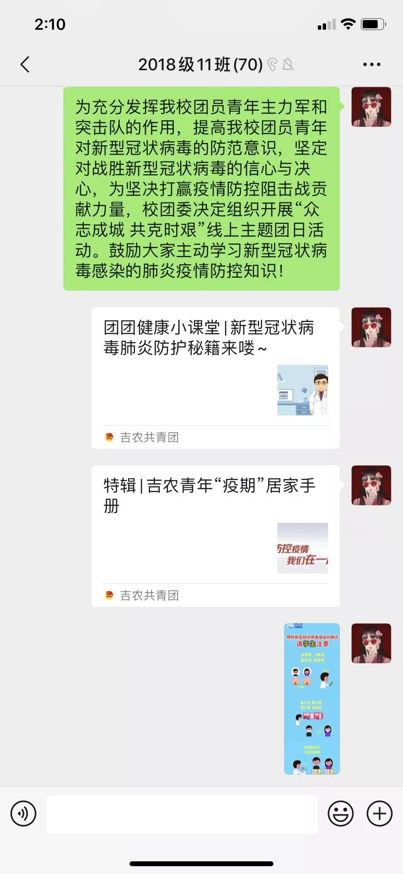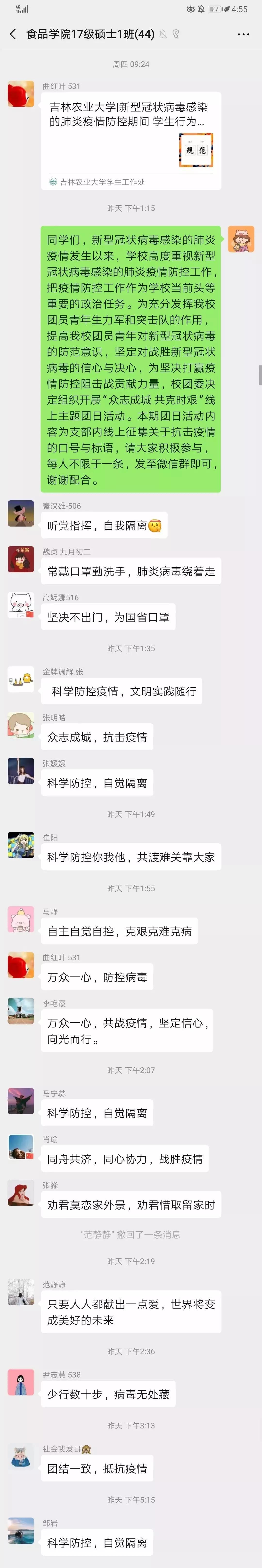 岁在庚子,一元复始,春暖花开,万物复苏。但此刻我们的心情却非常沉重。新型冠状病毒疫情感染的数字牵动着亿万中国人的心,全国上下对于疫情的防控工作正处于关键时期。为响应学校团委关于开展“众志成城 共克时艰”线上主题团日活动的通知,食品科学与工程学院各团支部利用网络平台,自觉倡导正确的防范措施,表明一同抗击病毒的决心,为坚决遏制疫情扩散,夺取防控斗争胜利贡献青春力量。