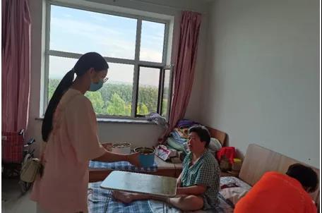 俗话说“民以食为天“,在实践活动的七天里,志愿者们每天都走进后厨跟随工作人员一起为老人们准备可口的饭菜,对于一些行动不便的老人,志愿者们将饭菜亲手送到他们床前。美味可口的饭菜凝聚着志愿者们对老人深深的关切,送至老人手中的不止是一顿晚饭,更是一份年轻人对老人的尊重、理解与关爱。