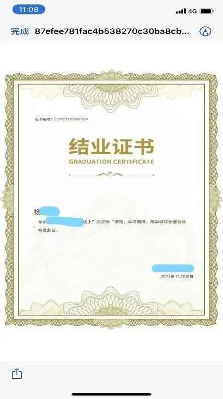 观看学习完所有章节短视频后,返回上级菜单可以看到对应课程“已结业”字样,表示该课程已经完成学习,点击“结业证书”自动下载结业证书【安卓手机自动下载,苹果手机请复制课程链接使用其他浏览器下载或使用PC端下载】。
