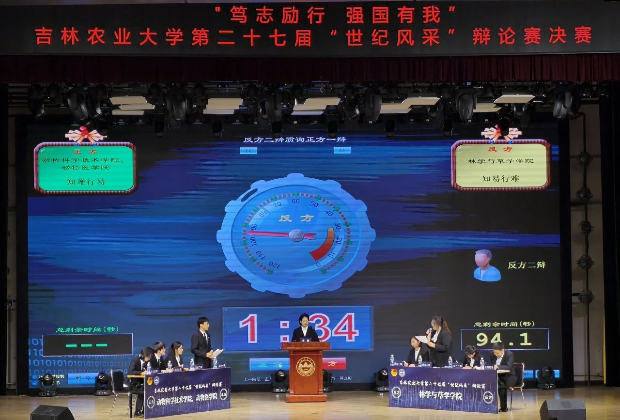 自今年3月启动以来,历经数月的激烈比拼,从初赛、复赛到半决赛,共计52场智慧火花的碰撞,最终动物科学技术学院、动物医学院代表队与林学与草学学院代表队脱颖而出,会师总决赛舞台。决赛聚焦于“知难行易”与“知易行难”的哲学辩题,正反双方辩手各抒己见,针锋相对,展现了非凡的辩论技巧与深邃的思考力,现场气氛紧张而热烈。