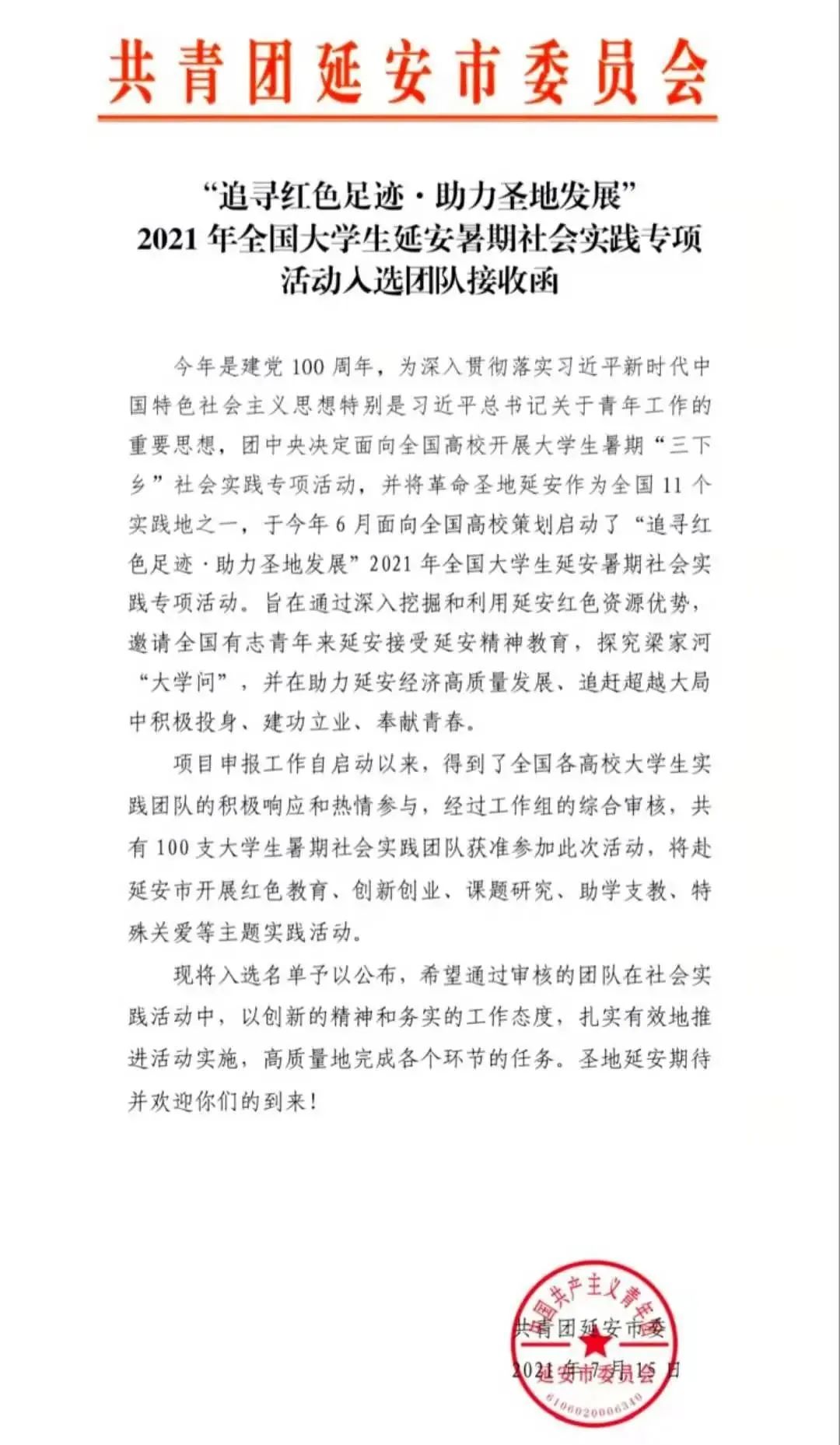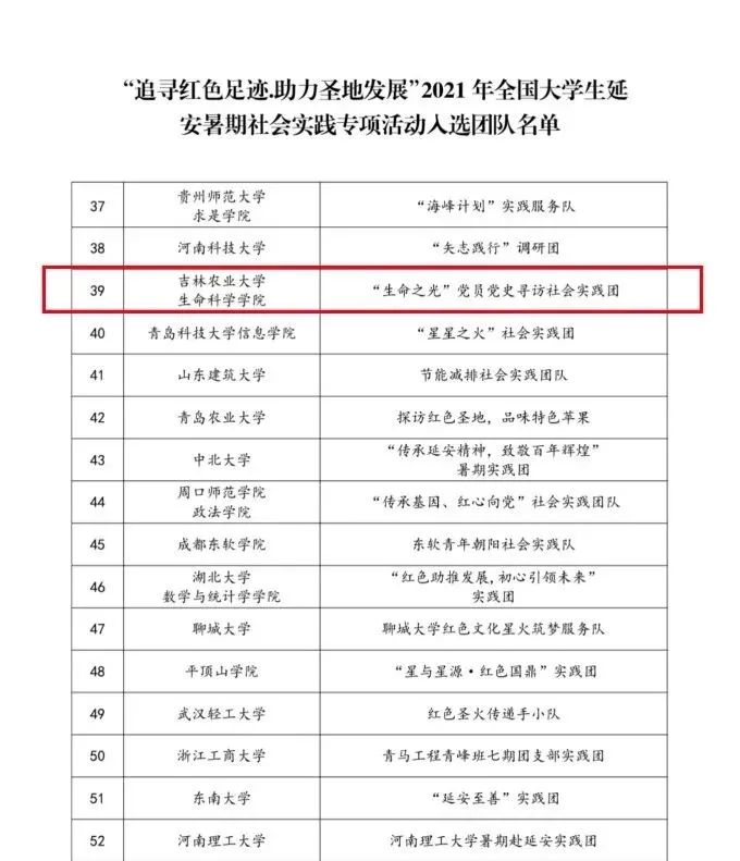 吉林农业大学生命科学学院“生命之光”党员党史寻访社会实践团成功入选由团中央面向全国高校开展的百支大学生暑期“三下乡”社会实践团专项活动——“追寻红色足迹·助力圣地发展”2021年全国大学生延安暑期社会实践活动。实践团于7月30日至8月8日赴延安开展传承革命精神,推进“四史”学习教育红色课程研究的主题社会实践。