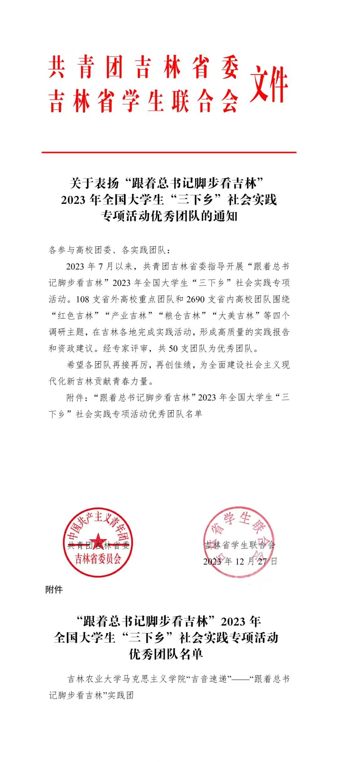 2023年7月以来,共青团吉林省委指导开展“跟着总书记脚步看吉林”2023年全国大学生“三下乡”社会实践专项活动。我校共组建该专项活动实践团166支,其中,12支团队与清华大学、复旦大学等全国十余所高校团队进行联合实践。实践团围绕“红色吉林”“产业吉林”“粮仓吉林”“大美吉林”等四个调研主题,在吉林各地完成实践活动。经专家评审,共50支团队获评“优秀团队”。其中,我校马克思主义学院“吉音速递”——“跟着总书记脚步看吉林”实践团荣获本次专项活动“优秀团队”,并收到了共青团吉林省委、吉林省学生联合会发来的表扬信。