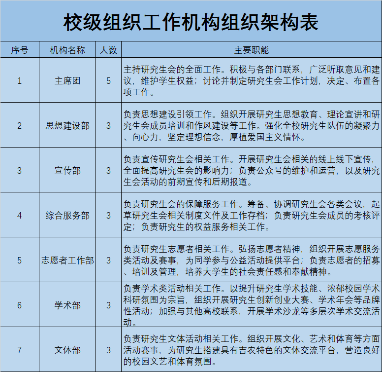 按照《关于推动高校学生会(研究生会)深化改革的若干意见》要求,根据我校本科生、研究生规模,吉林农业大学第十六届学生会、第三届研究生会主席团分别拟由5人组成,其中拟设执行主席各1人。