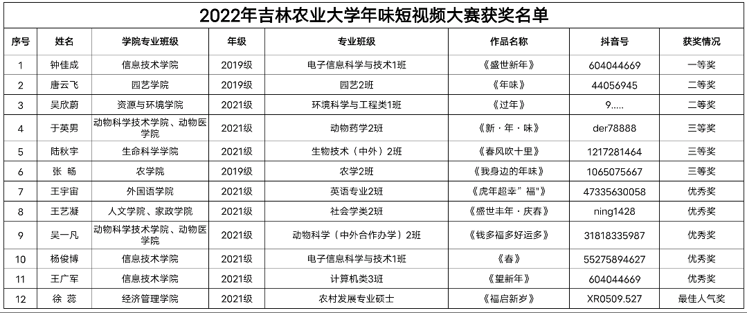 在2022年新春佳节前夕,为丰富同学们的假期生活,展现全国各地新春佳节的热闹景象,共同描绘阖家团圆的美好画卷,由吉林农业大学团委发起的“2022年吉林农业大学年味短视频大赛”已经落下帷幕。新春佳节热闹多,年味视频一摞摞。本次比赛大家都踊跃报名,利用短视频的形式向我们展示了在他们眼中的新年,让我们感受到了形式多样的年味。